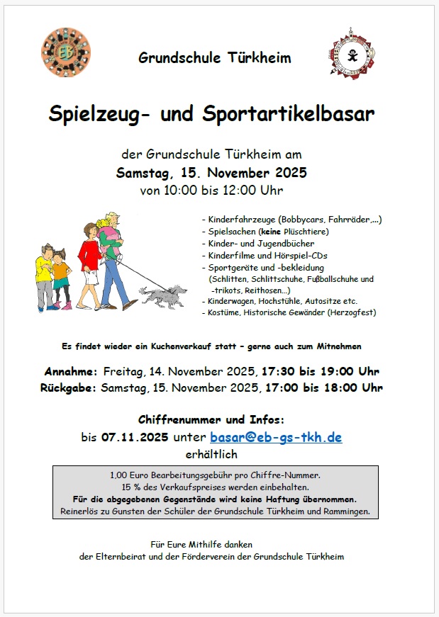 Der Elternbeirat und Förderverein der Grundschule Türkheim veranstaltet einen Spielzeug- und Sportartikelbasar zugunsten unserer Grundschulkinder.